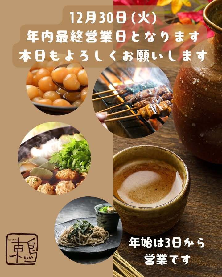 本日、30日(火)年内最終営業日となっております。今年の締めくくりに焼鳥とこんにゃく蕎麦はいかがでしょうか。
